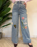 Jeans con fiori in rilievo all’uncinetto tela fissa